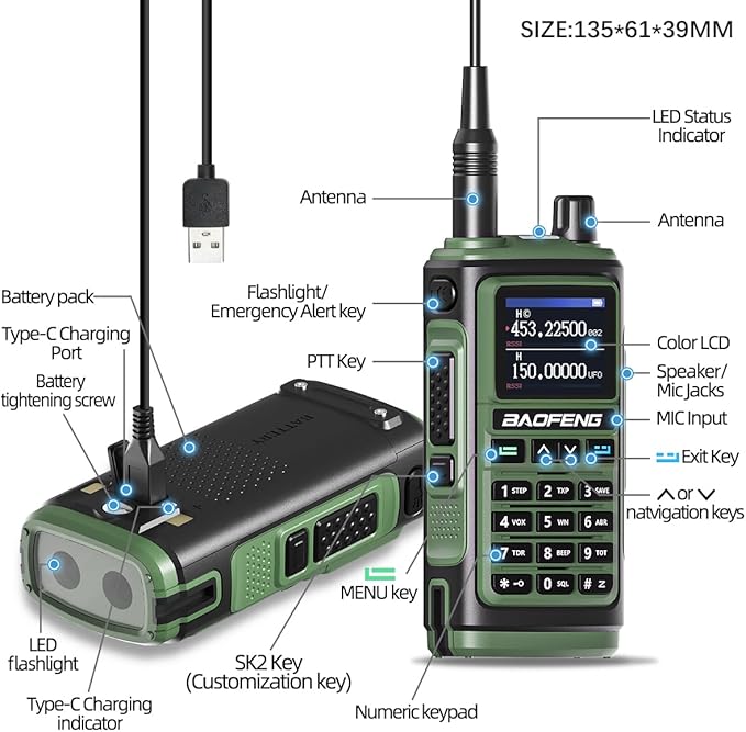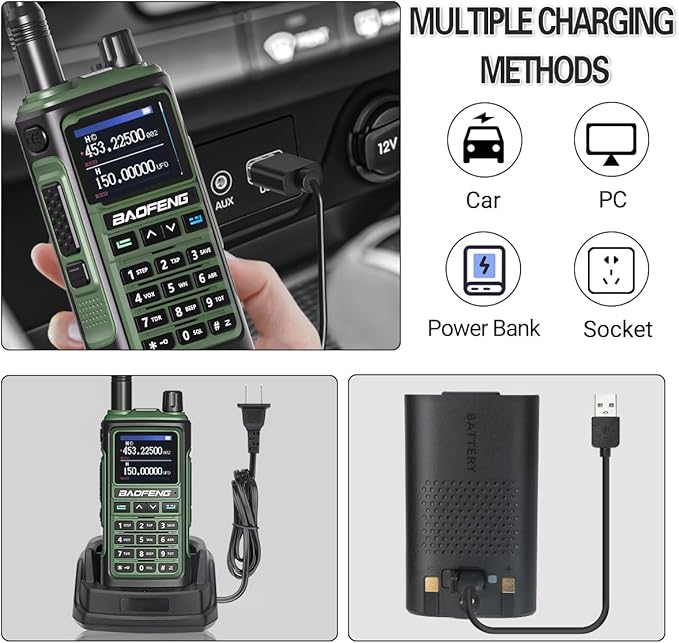 - ✅【Multiple Charging Methods】Each Radio equippend with USB-C Charging Cable+US Base Charger+2500mAh Rechargeable Larger Battery,you can easily charge it from power bank、PC、car、wall、laptop and any usb slot and long standby time.