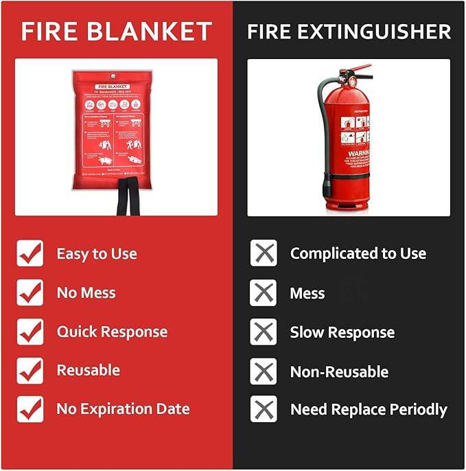 - Fire Blanket vs. Fire Extinguisher: Compared to fire extinguishers, fire blankets are incredibly easy to use. There are no complex instructions to read, no intricate steps to follow, and no training required. A fire blanket never expires, requires no maintenance, and leaves no mess after use.