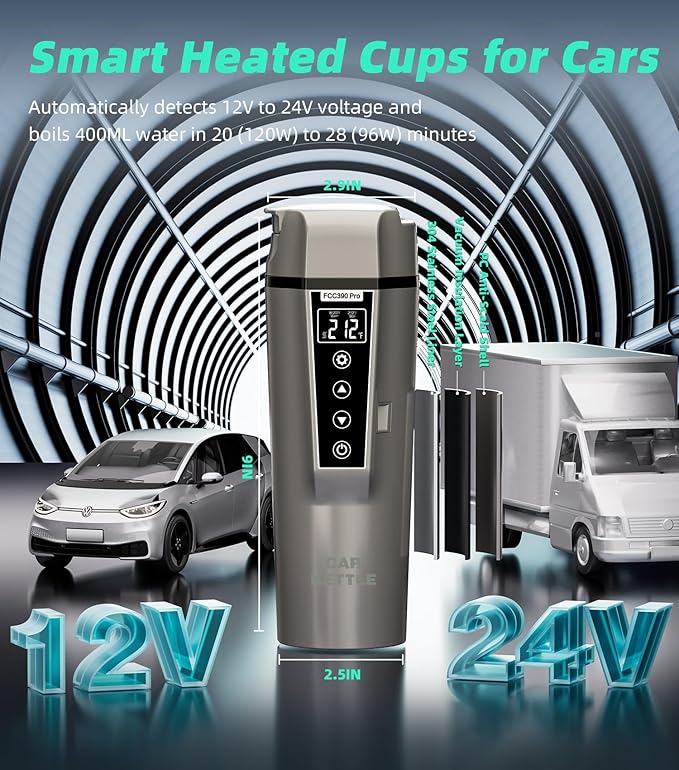 - Widely Used Car Heating Cups : Car water boiler for a 12V car or 24V truck, plug and play cigarette lighter. REMINDER: When the car water heater heats up, the cup and power cord will have some heat, which is normal. Please read this manual carefully before using it.