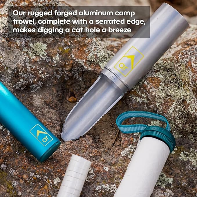 - Aluminum Trowel - Our rugged forged aluminum camping trowel, complete with a serrated edge, makes digging a cat hole a breeze.