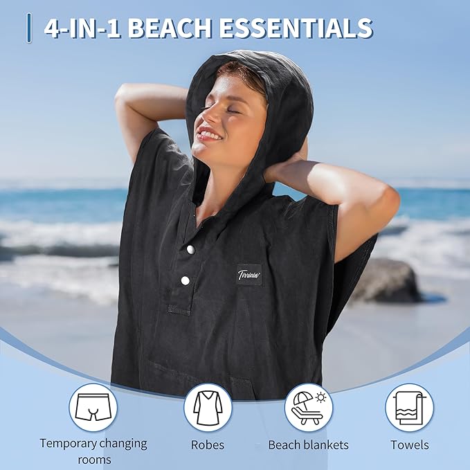 - 4-in-1 Beach Essential: Our multifacational pullover surf poncho is a quintessential companion for any beach enthusiast. Effortlessly transitioning from a cozy towel to a chic robe, it further extends its utility as a spacious beach mat. But its true innovation shines through as a mobile changing station, perfect for slipping into your swim gear, diving attire, or kayaking essentials with ease and privacy. Whether you're preparing for a dive or drying off post-swim, this sandcloud poncho is your