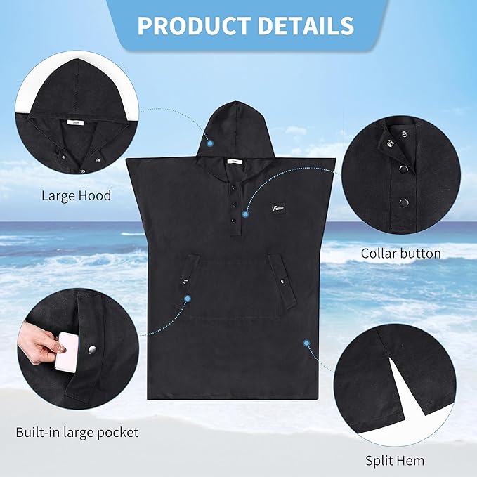 - Portable Changing Room: Engineered for convenience and privacy, our surfing poncho serves as your very own portable dressing space. Equipped with strategic side openings and a change hole, transitioning from swimwear to streetwear becomes a breeze. The quick-dry fabric ensures you stay comfortable while changing clothes, whether you're slipping out of your wetsuit or into your outfit. Snap-button closures at the neckline allow for swift adjustments, making every change as smooth and swift as