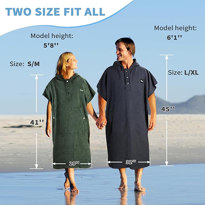 - Stylish Surf Poncho: Our surf changing towel is not only a stylish accessory but also a practical solution for changing clothes discreetly at the beach. Complete with a handy beach towel feature, it allows you to dry off quickly and conveniently. Offered in sizes M and L, it comfortably accommodates most adults and teenagers, making it an excellent choice for gifting. Indeed, one of the best gift ideas for husbands and dads who love spending time at the beach or engaging in water sports.