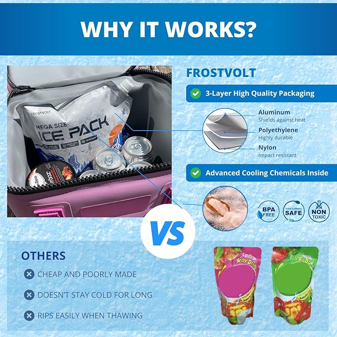 - Durable Three-Layer Design - Frostvolt cooler ice packs reusable are built for repeated use with a robust three-layer structure (aluminum, polyethylene and nylon), ensuring long-lasting reliability