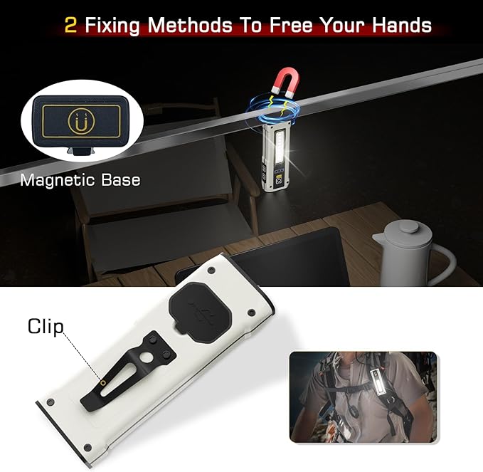 - 【Lightweight & Portable Design】Weighing in at just 55g, this work light is incredibly lightweight and easy to carry. Its compact design ensures it fits comfortably in your hand or pocket. The built-in rear clip allows for easy attachment to belts or bags, while the strong magnet at the base provides secure mounting on metal surfaces, giving you hands-free lighting options.