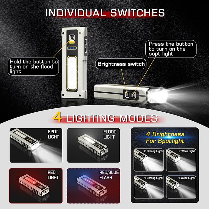 - 【Multiple Lighting Modes for Versatility】With 4 different lighting modes, this EDC flashlight adapts to various situations. Choose from the spotlight, floodlight, red light, or red-blue strobe mode. The spotlight mode includes 4 adjustable brightness levels, allowing you to customize the light intensity according to your specific needs, making it perfect for both professional and personal use.