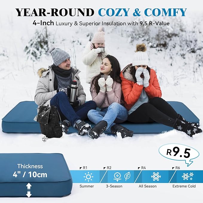 - 𝐊𝐄𝐄𝐏 𝐘𝐎𝐔 𝐖𝐀𝐑𝐌 𝐈𝐍 𝐀𝐋𝐋 𝐒𝐄𝐀𝐒𝐎𝐍𝐒 - Winter camp? Yes! We've designed this camping air mattress to provide ample isolation and warmth in all seasons. With a high R Value of 9.5, our foam camping mat serves optimal for 4-season car camping and also ideal as a guest bed for overnight guests, providing you and your guests with the feeling as in your own beds.