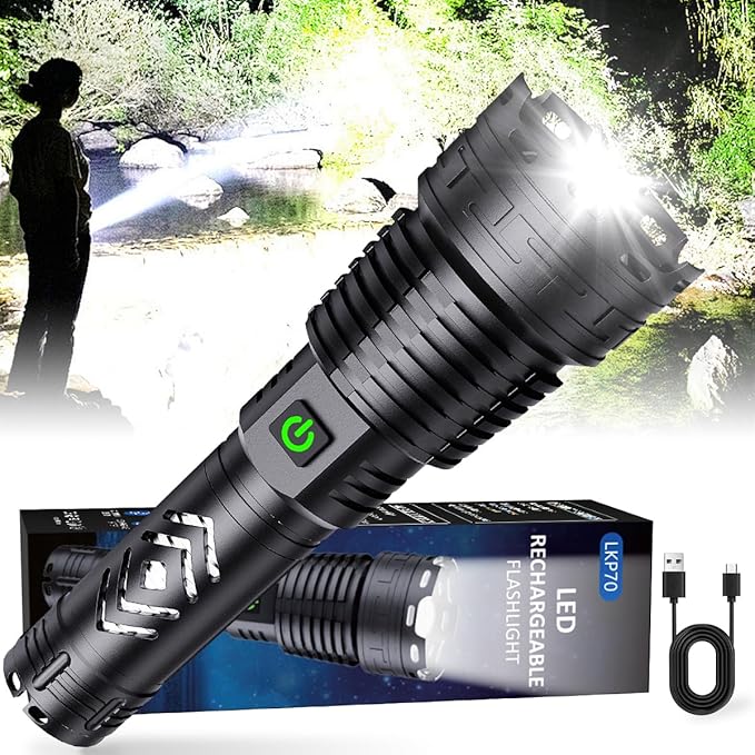 - 【990,000 LUMENS BRIGHTEST FLASHLIGHT】The LED rechargeable flashlights features new upgraded high lumen LED chips. This flashlights high lumens rechargeable has an incredibly high brightness of up to 990,000 lumens, which is 40 times brighter than a regular LED flashlight. It can easily illuminate an area of 4000 square feet.
