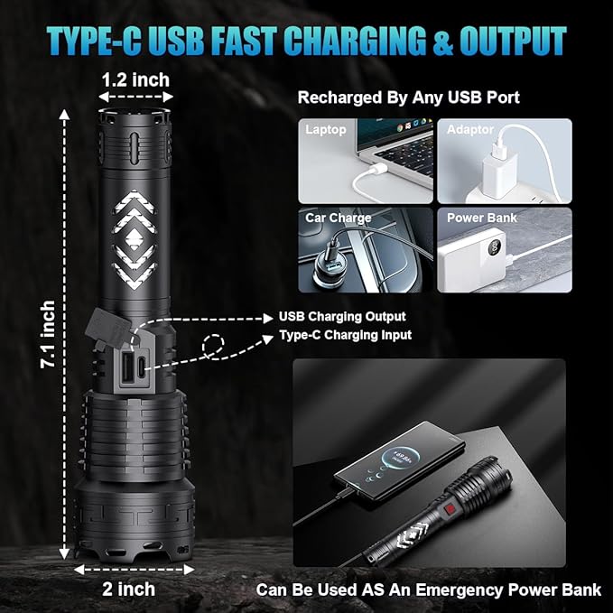 - 【USB QUICK CHARGING FLASHLIGHT】The USB rechargeable flashlights rechargeable battery has a high capacity of 10,000mAh, providing a working time of 8-20 hours and a lifespan of up to 250,000 cycles. It is safer, more reliable, and more durable. It uses a fast-charging interface and has circuit protection features such as overcharge protection, over-discharge protection, over-voltage protection, and short circuit protection, which can extend the tactical flashlight's lifespan.
