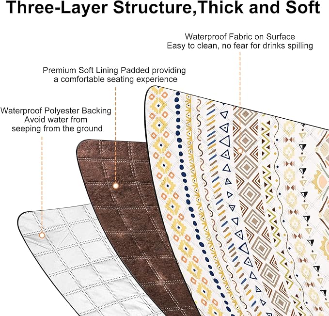 - Soft & Thick Three -Layer Structure: Our picnic blanket is crafted with a top layer of comfortable polyester fabric, a middle layer filled with plush microfiber, and a waterproof polyester film bottom, this three-layer construction, enhanced by high quality sewing technology, offers unmatched comfort and durability, ensuring that your picnic experience is as enjoyable as it is luxurious