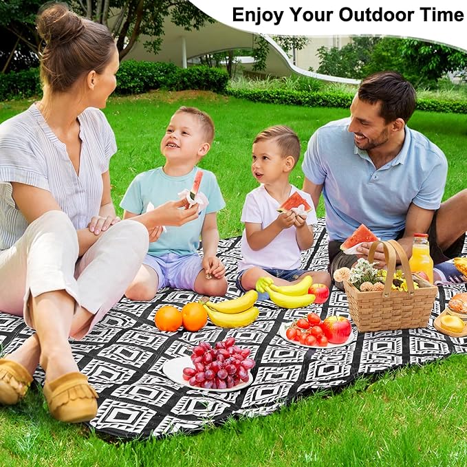 - Soft & Thick Three -Layer Structure: Our picnic blanket is crafted with a top layer of comfortable polyester fabric, a middle layer filled with plush microfiber, and a waterproof polyester film bottom, this three-layer construction, enhanced by high quality sewing technology, offers unmatched comfort and durability, ensuring that your picnic experience is as enjoyable as it is luxurious