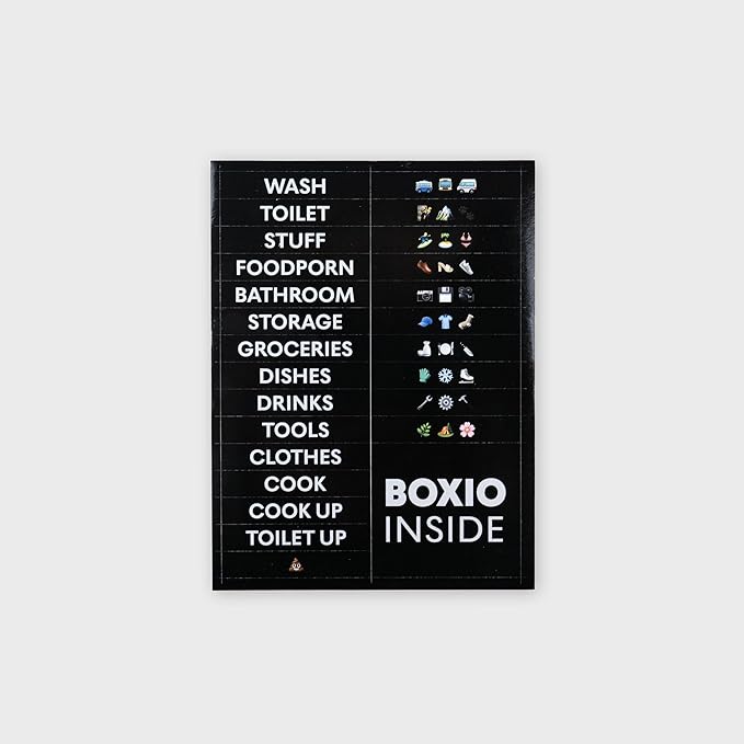 BOXIO - Stickers: 26 Weatherproof Self-Adhesive Labels for BOXIO Toilet, Wash, Cook, Solo Perfect as Organiser for Camping, Outdoor, Household - Waterproof, Photo Stickers, Labels, Stickers, 5x1 cm
