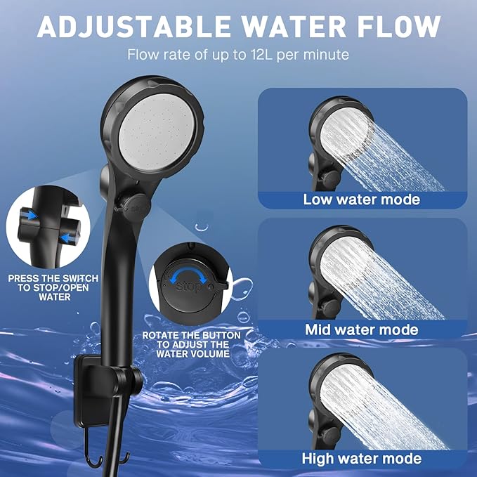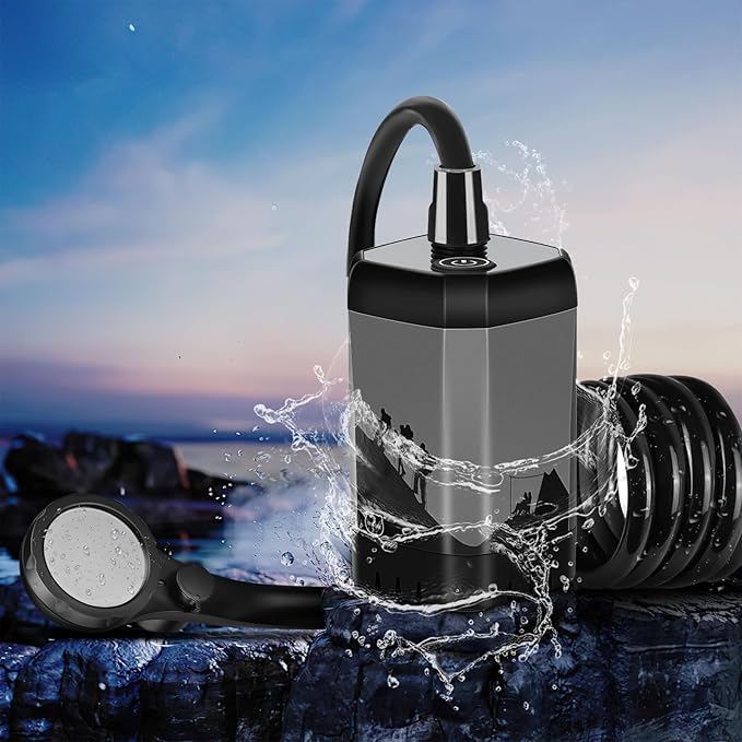 - 【Easy to Assemble and Operate】: Portable camping shower is very easy to use, just press and hold the switch on the pump for about 2 seconds to start the pump .You can control the water flow rate at will through the stepless adjustment knob on the shower head. With the water-stop ball valve design, the water flow rate increases by 150%.You can also switch between energy-saving mode and high-efficiency mode to easily control the water flow rate.