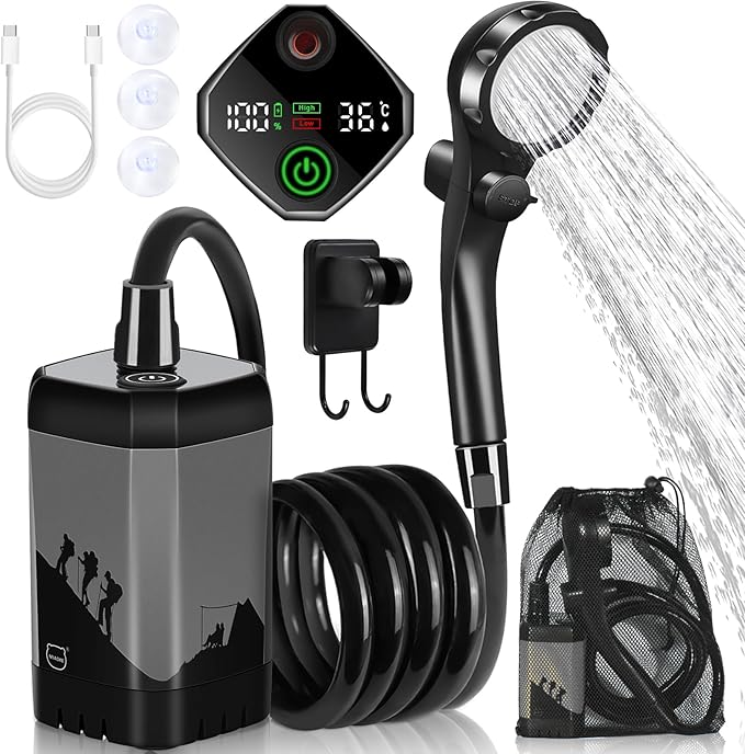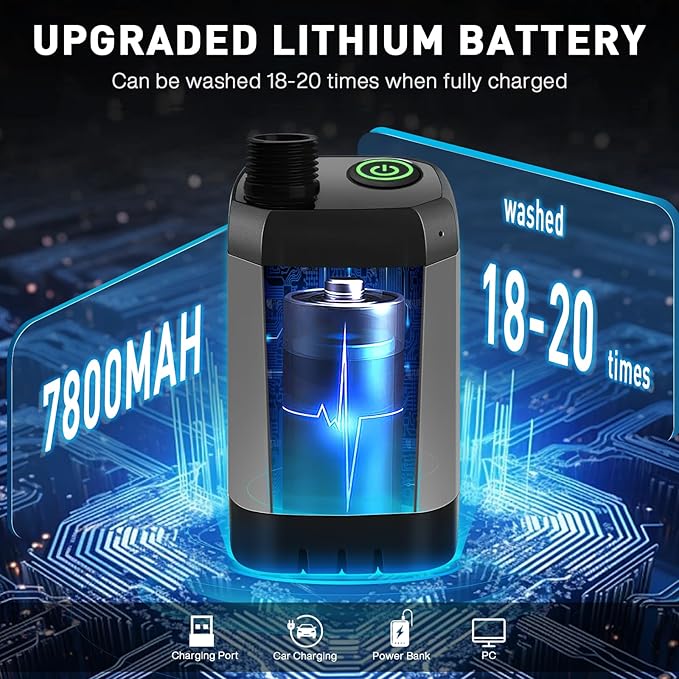 - 【Long-Lasting Rechargeable Battery】:Portable camping shower has a built-in 7800mAh lithium battery that provides 120-160 minutes of battery endurance per charge in just 3-4 hours.This camping shower has a TYPE-C charging port, which is truly universal for multiple charging cables,you can charge it via a mobile phone charger (5V 2A), a laptop's USB output, or a car's USB output.No need to have a dedicated charging cable.