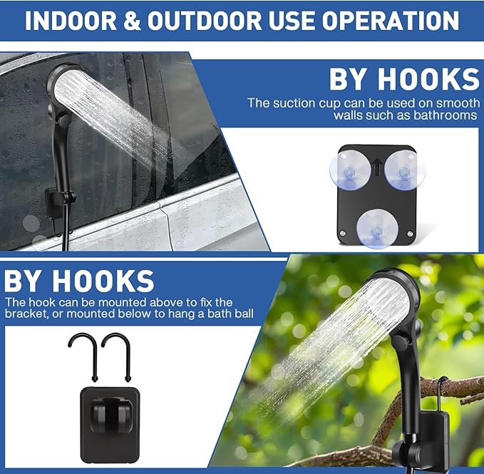 - 【Compact and Portable】:The portable camping shower kit weighs only 2.3 pounds,comes with a mesh storage bag for easy carrying and storage.The provided suction cup can fix the shower head on any smooth flat surface.The hook allows you to hang the shower head safely on a tree.Suitable for camping, hiking, travel,pet cleaning, car washing and plant watering.