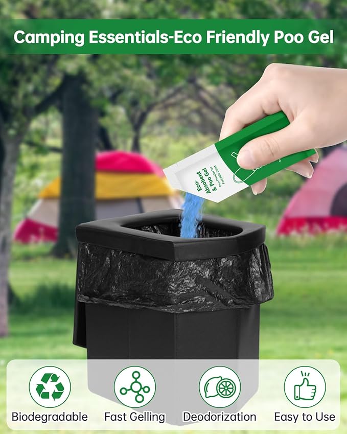 - 𝐑𝐚𝐩𝐢𝐝𝐥𝐲 𝐒𝐨𝐥𝐢𝐝𝐢𝐟𝐲 & 𝐃𝐞𝐨𝐝𝐨𝐫𝐢𝐳𝐞𝐫 - Included 80 pack(10g/pack) camping toilet poo gel. Quickly solidify pee & poo in 1-2 minutes while deodorizing odors for clean & fresh outdoor camping experience. Perfect for outdoor toilet in camping, hiking, backpacking, road trip, or emergencies. This essential camping hygiene & sanitation products ensures you tackle any outdoor human waste with ease, maintaining a tidy, pleasant environment.
