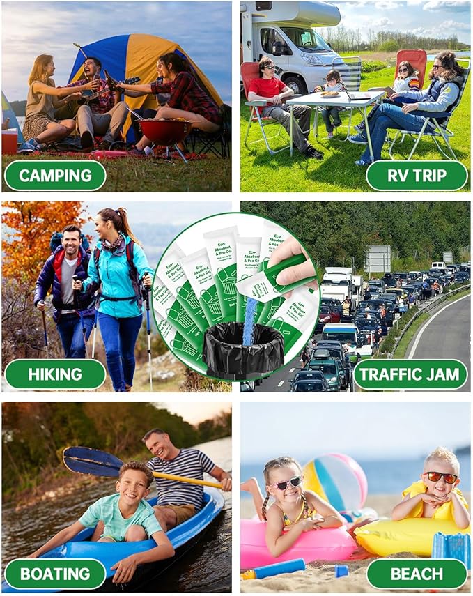 - 𝐑𝐚𝐩𝐢𝐝𝐥𝐲 𝐒𝐨𝐥𝐢𝐝𝐢𝐟𝐲 & 𝐃𝐞𝐨𝐝𝐨𝐫𝐢𝐳𝐞𝐫 - Included 50 pack(10g/pack) camping toilet poo gel. Quickly solidify pee & poo in 1-2 minutes while deodorizing odors for clean & fresh outdoor camping experience. Perfect for outdoor toilet in camping, hiking, backpacking, road trip, or emergencies. This essential camping hygiene & sanitation products ensures you tackle any outdoor human waste with ease, maintaining a tidy, pleasant environment.