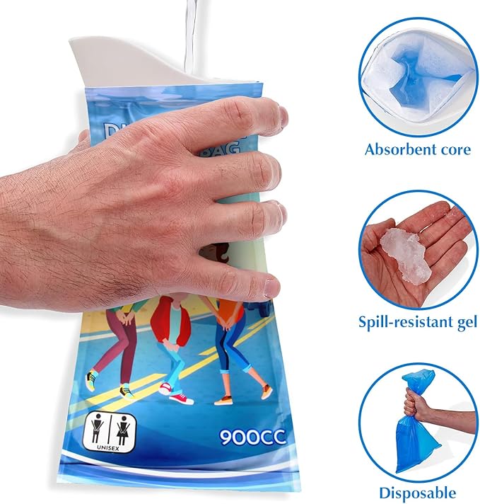 - 【 High Absorbent & Large Capacity 】 The Emergency Portable Pee Bag has a high-absorbency pad and cotton that quickly soak up liquids in 20 seconds and securely seal inside the bag.The travel urinal capacity has been upgraded to 900ml, which is sufficient for adults to use