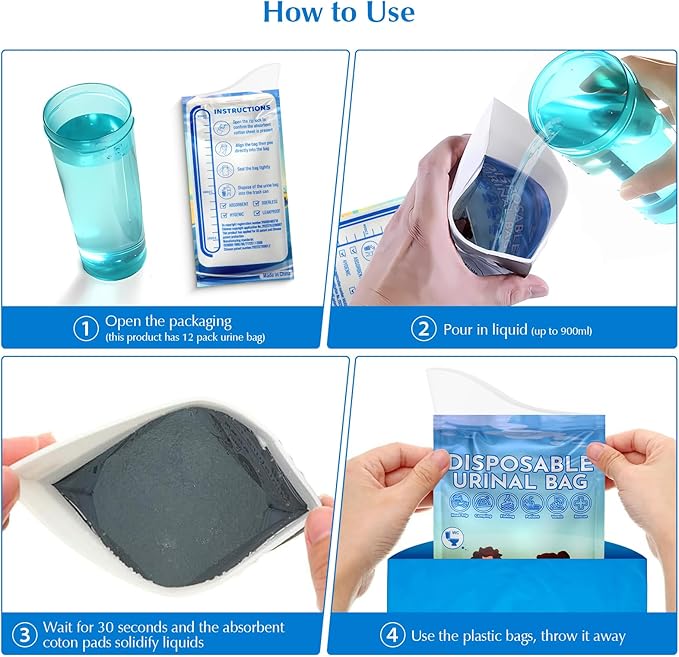 - 【 Easy to Use 】 Our Disposable Urine Bags simply open the bag to start using it. After use, place the urine bag into the provided blue bag and dispose of it in the trash bin