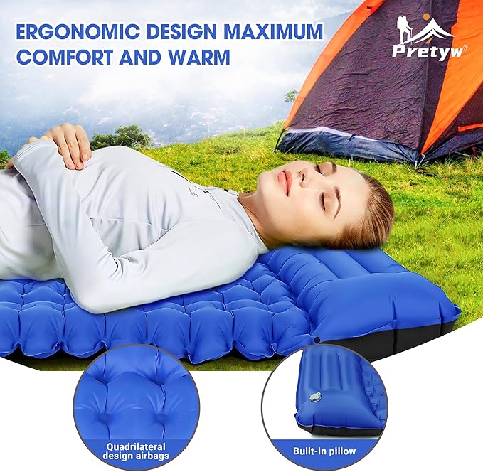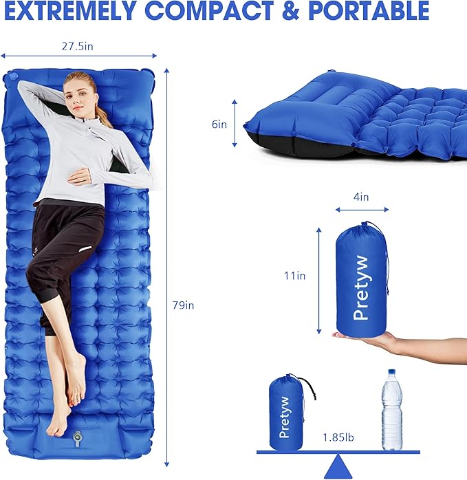 - 【Upgraded Support & 4" Thick Sleep Support】Crafted with the toughest outdoor-grade material, Pretyw sleeping pad for camping is ideal for any weather. Measuring 79 x 27.5 x 4 inches, our self-inflating air mattress is long enough for taller individuals. The 4-inch thickness and upgraded support make it perfect for side sleepers, and the built-in pillow adds extra comfort and convenience. This setup ensures a restful sleep during extended outdoor excursions.