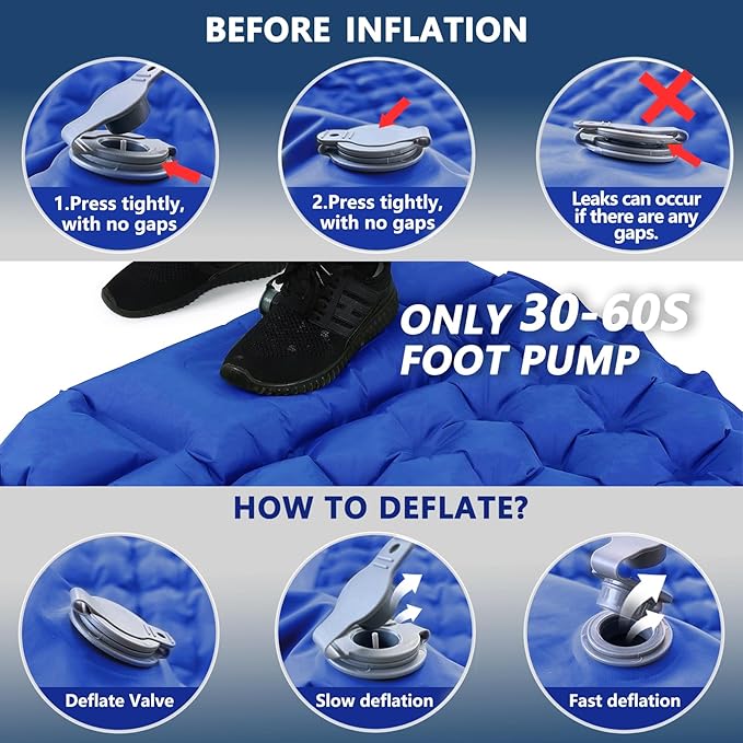 - 【Foot Press to Inflate-Only 30-60s Needed】No need to use your hands, mouth, or a pump to inflate our camping sleeping pad. Just step on the built-in pump spot with your foot, and it fully inflates in 0.5-1 minutes. With anti-leak valves, you don't have to worry about air escaping! Plus, it deflates super quickly—just pull out the deflation plug.