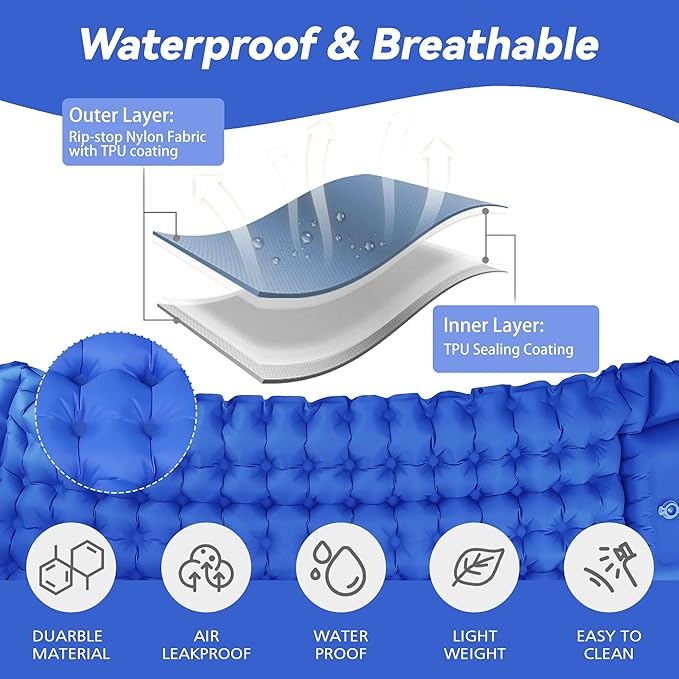 - 【Premium Nylon and TPU】Our sleeping pad is made from ultra-thick 40D nylon with a multi-layer TPU design, ensuring outstanding durability and waterproof performance. It won’t tear, even on rough terrain. Cleaning the inflatable camping mattress is a snap—just wipe it down. Plus, the air mattress includes three repair patches for quick fixes if the inflatable pad gets damaged.