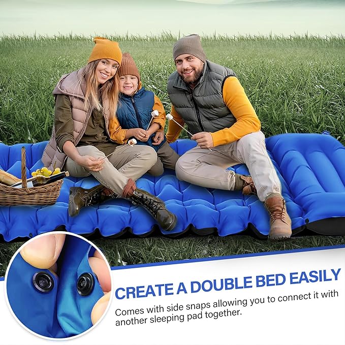 - 【What You Will Get?】The package includes 1 sleeping pad, 1 storage bag, 1 Binding Belt, 1 instruction manual, and 3 patches. This sleeping pad features the latest unique design with buttons on both sides for easy connection with other pads to form a double bed, providing extra relaxation space. We believe you'll love our inflatable sleeping pad. If you have any questions or are not satisfied, please contact us anytime, and we will provide the best solution.