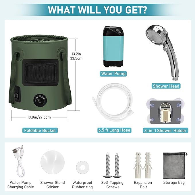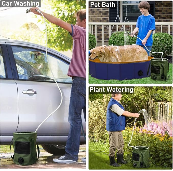 - Complete Shower Kit: The portable shower kit comes with a mesh storage bag for easy draining and carrying. With a 3-in-1 shower holder, our camping shower can be mounted with suction cups, adhesives and screws according to your needs. Total weight of shower pump and foldable bucket is about 2.8 lbs. Lightweight & compact shower kit for camping, ideal for hiking, traveling, pet cleaning, car washing and plant watering