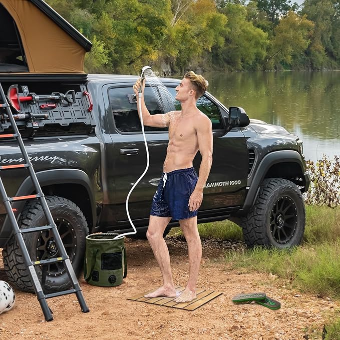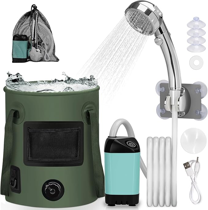 - High Quality: The shower pump kit is made of high quality ABS material, waterproof. 6.5 feet long thick water hose makes it not easy to kink during use. Foldable bucket and hose are made of PVC material, making them strong, wear-resistant, and shock-proof. Portable shower kit built to last for a long time, making it a reliable choice for your outdoor activities