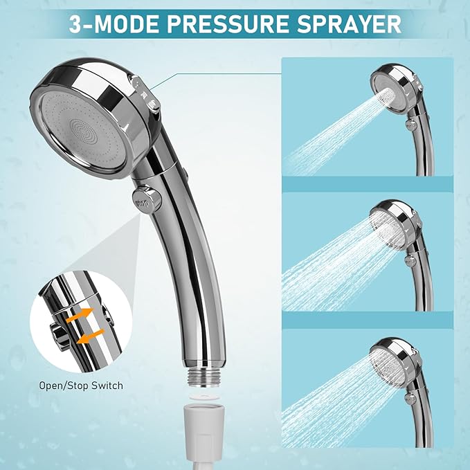 - 3-Mode Pressure Sprayer: The camping shower is designed with three water modes, which can be easily switched by the buttons on the side of the shower head, and the water stop switch can easily control the water flow. Equipped with a filter, our shower pump can purify the water and ensure a clean and hygienic outdoor shower.Leak-proof O-ring in the shower head to prevent water from spilling, ensuring a great outdoor bathing experience