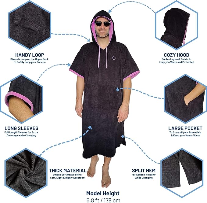 - HOOD UP, WARM UP - Wrap yourself in warmth! Our integrated hooded towel adult with drawstrings adds an extra touch of coziness, keeping you snug after water activities. Our beach poncho is your personal changing room that protects you from the sun, cold, rain and wind. This surf towel completes your beach day.