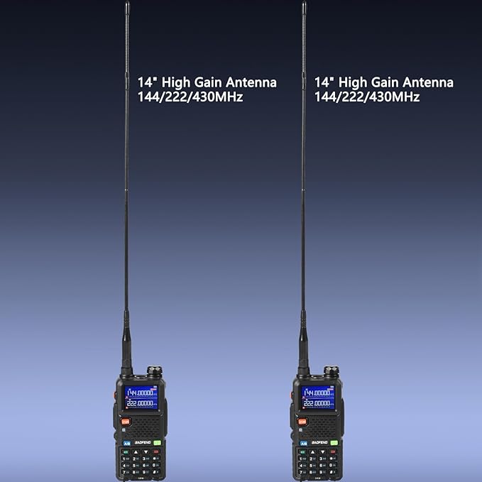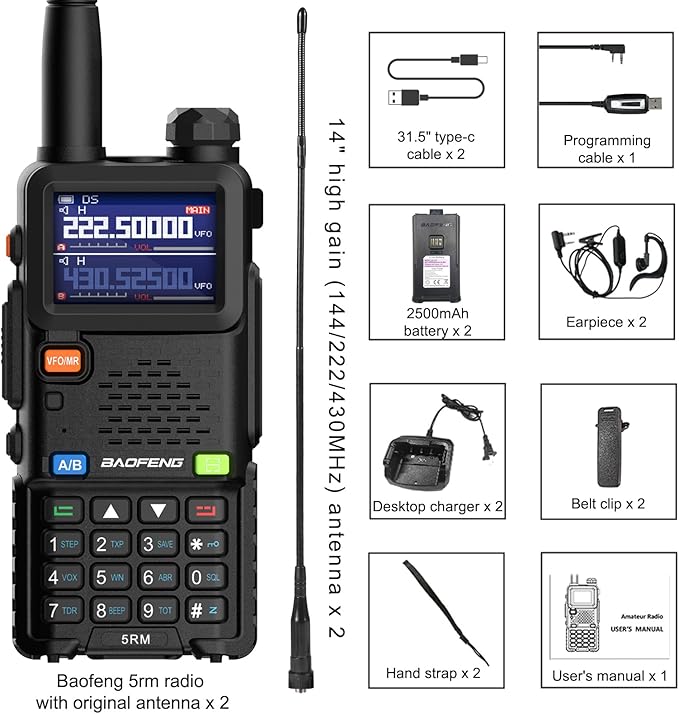 - Included Components : Baofeng 5rm radio with original antenna x 2, 14" high gain T14 antenna(144/222/430MHz) x 2, 31.5" type-c cable x 2, Baofeng programming cable x 1, 2500mAh rechargeable battery x 2, Earpiece x 2, Desktop charger x 2, Belt clip x 2, Hand strap x 2, User's manual x 1. Baofeng 5rm radio with original antenna x 2, 14" high gain T14 antenna(144/222/430MHz) x 2, 31.5" type-c cable x 2, Baofeng programming cable x 1, 2500mAh rechargeable battery x 2, Earpiece x 2, Desktop charger x… See more