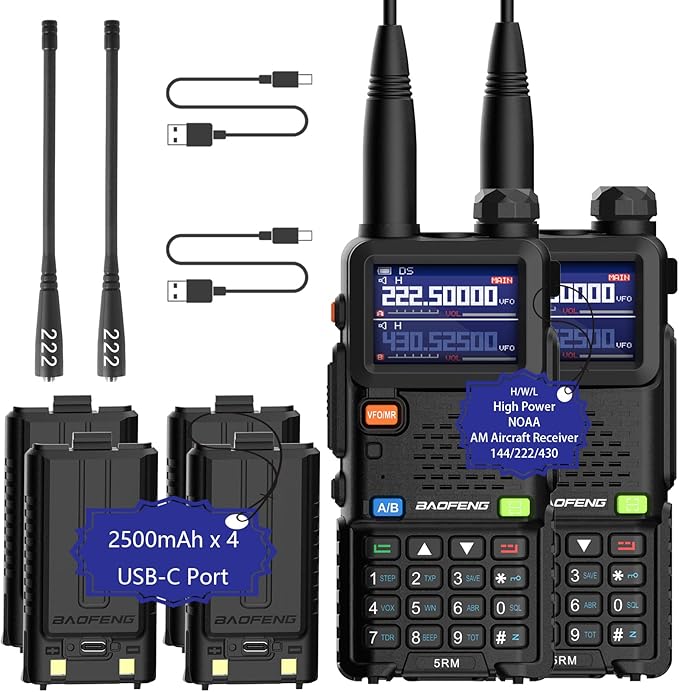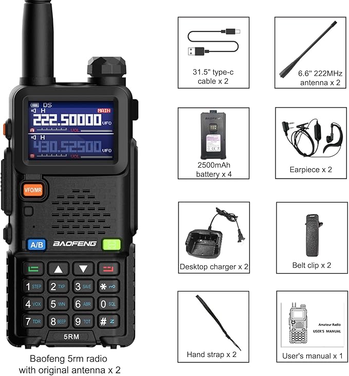 - Included Components : Baofeng 5rm radio with original antenna x 2, 6.6'' S27 antenna(222MHz) x 2, 31.5" type-c cable x 2, 2500mAh rechargeable battery x 4, Earpiece x 2, Desktop charger x 2, Belt clip x 2, Hand strap x 2, User's manual x 1. Baofeng 5rm radio with original antenna x 2, 6.6'' S27 antenna(222MHz) x 2, 31.5" type-c cable x 2, 2500mAh rechargeable battery x 4, Earpiece x 2, Desktop charger x 2, Belt clip x 2, Hand strap x 2, User's manual x 1.