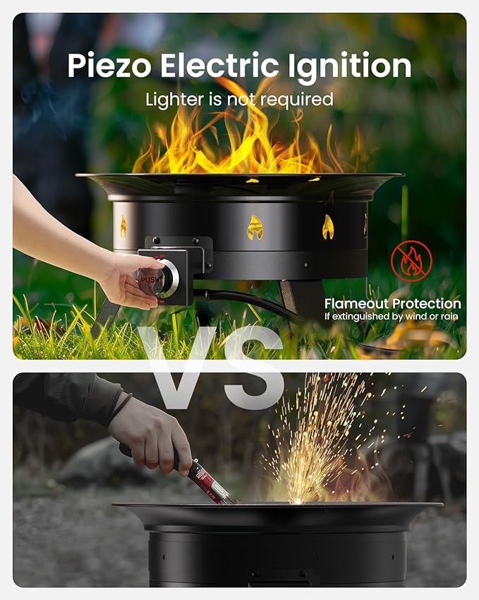 - Piezo Electric Ignition: Piezo ignition is more secure and reliable with no batteries or external power required. Simply push and hold the electroplated knob for 3 seconds, then turn to MAX and hold for 5 seconds. The propane fire pit is designed to light reliably every time.