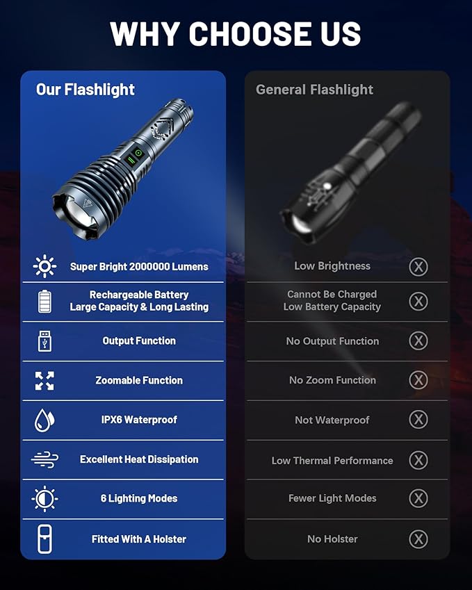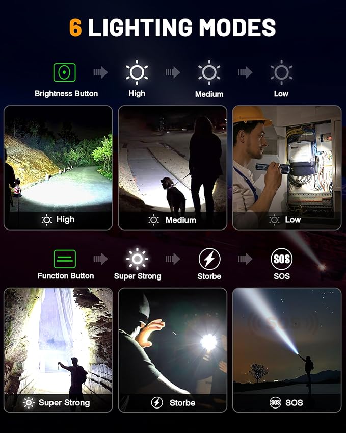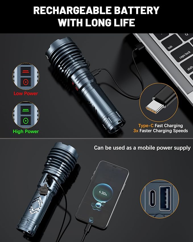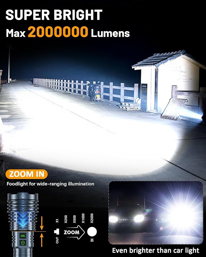 - Special Feature : Super Bright 2000000 High Lumen Flashlights, Max.8000 Ft Long Range, Adjustable Focus for Spotlight & Flodlight Flashlight,Multifunctional Flashlights with Adjustable 6 Light Modes, Rechargeable Flashlight, 5000mAh High Power Battery,25H Long Battery Life, Durable, Waterproof, Dustproof, Impact Resistant, Rust Resistant, Shock Resistant, Weatherproof,Non Slip Grip, Portable, Adjustable Strap & Holster for Easy Carrying, Gifts Box for Father's Day/Christmas Days Super Bright 2000000 High Lumen Flashlights, Max.8000 Ft Long Range, Adjustable Focus for Spotlight & Flodlight Flashlight,Multifunctional Flashlights with Adjustable 6 Light Modes, Rechargeable Flashlight, 5000mAh High Power… See more