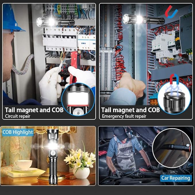 - Special Feature : Super Bright, Magnetic ,Rechargeable , Zoomable, Water Resistant, COB sidelight , Weather & Shock Resistant, Smart one key Turn-off,4 Operating Modes (High / Low / Emergency/ COB sidelight), Lightweight & Pocket-Sized,Easy to Use, Anti-Roll Body, Tactical Switch, 360° COB work Light Super Bright, Magnetic ,Rechargeable , Zoomable, Water Resistant, COB sidelight , Weather & Shock Resistant, Smart one key Turn-off,4 Operating Modes (High / Low / Emergency/ CO… See more