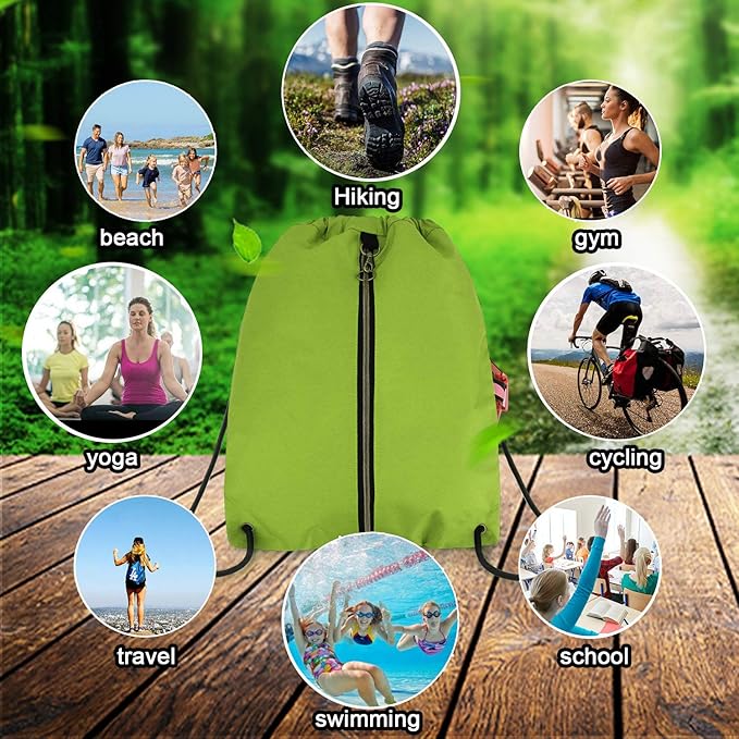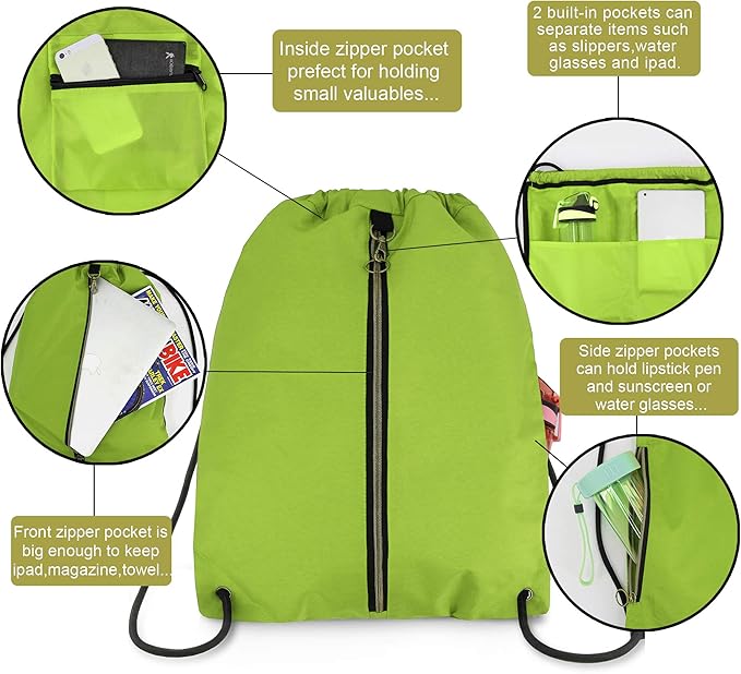 - 【CONVENIENT MULTI POCKET】::Our drawstring backpack includes 5 additional pockets. 1 large zipper additional pockets on the front of the drawstring bag for towels, clothes, small umbrellas or other items. 1 zipper pocket on the backside of the sports bag for women for holding small valuables like mobile phones, wallets, etc, 2 built-in pockets can separate items which can hold slippers and water glasses. 1 inside zip pocket for keys. It is safe for you to take the items conveniently.