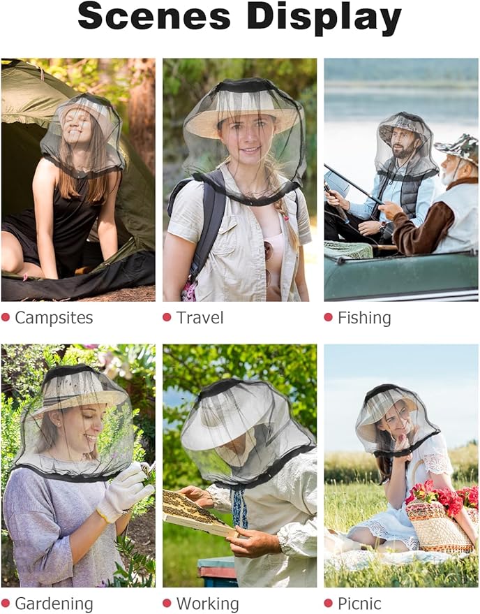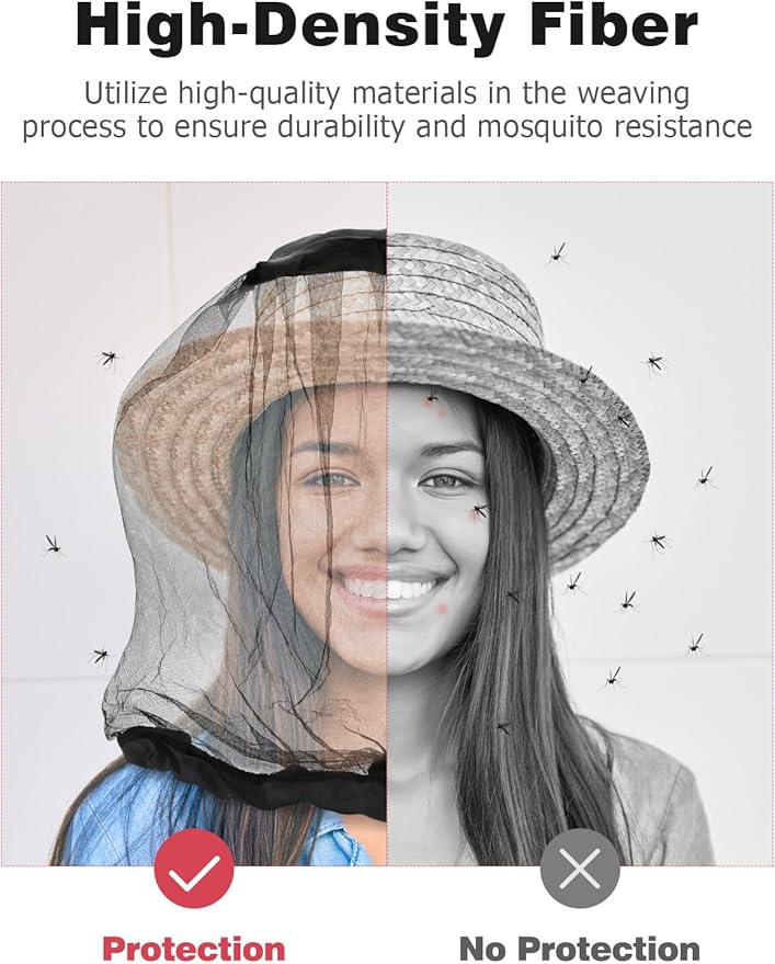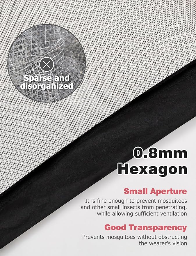 - Ultra-Fine Mesh: The mosquito head nets mesh is incredibly fine at only 0.8mm, ensuring optimal protection from mosquitoes while being soft and comfortable. The black mesh allows for clear visibility of the surroundings while keeping you cool.