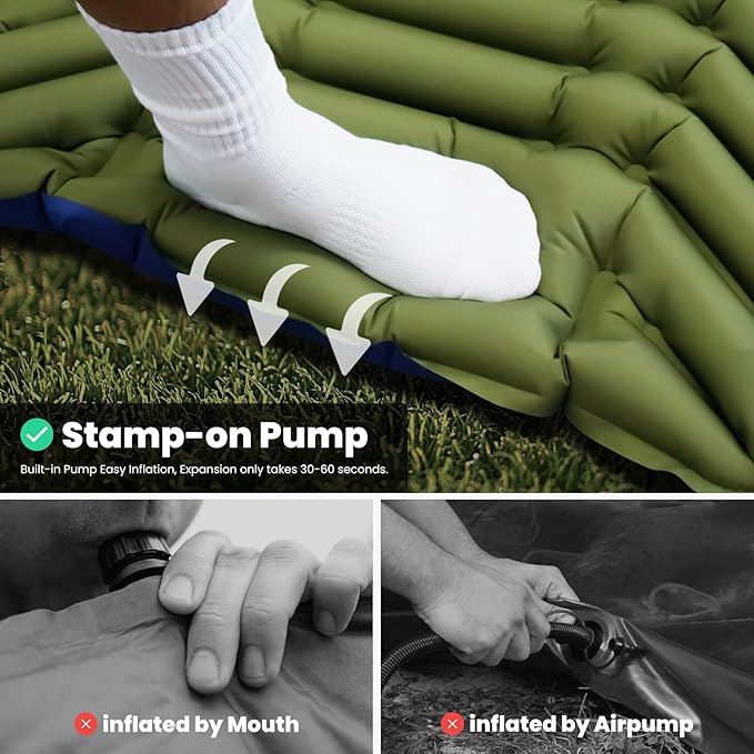 - 【Advanced built-in Foot Pump】No need to inflate with your hands, mouth, or a pump for our camping sleeping pad. It just only takes 30s after you inflate the sleeping mat fully by stamping the spot of the built-in pump with your foot. children, and the elderly can easily complete it.