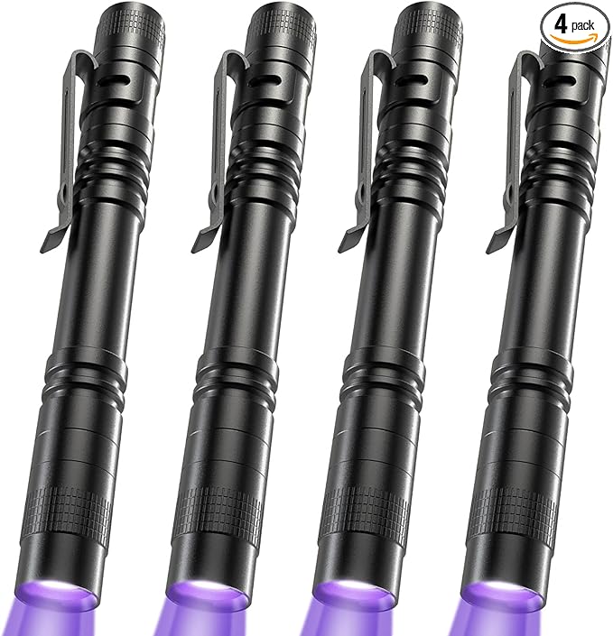 - ▶【QUALITY GUARANTEE】You will get 4*blacklight penlights, each flashlight powered by 2*AAA batteries(Not Included), Military grade aluminum material, and the portable design make our black light perfect gift choice for family, friends and pet-lovers. 90-Day Money Back Guarantee.