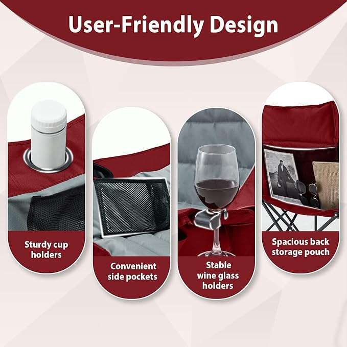 Oversized Camping Chair, Double Folding Loveseat Camping Couch with Pocket, Cup Holder and Carry Bag, Heavy Duty Portable Camping Chairs for Adults, Fishing, Sports, Trip, up to 660lbs, Red