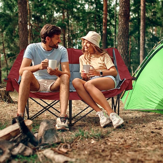 - Sturdy and Long-lasting: Built with a robust high-strength steel frame and reinforced components, the double seat camping chair supports up to 660 lbs. The frame is powder-coated to resist corrosion and fading, while four layers of 600D tear-resistant Oxford fabric ensure sturdily and breathability
