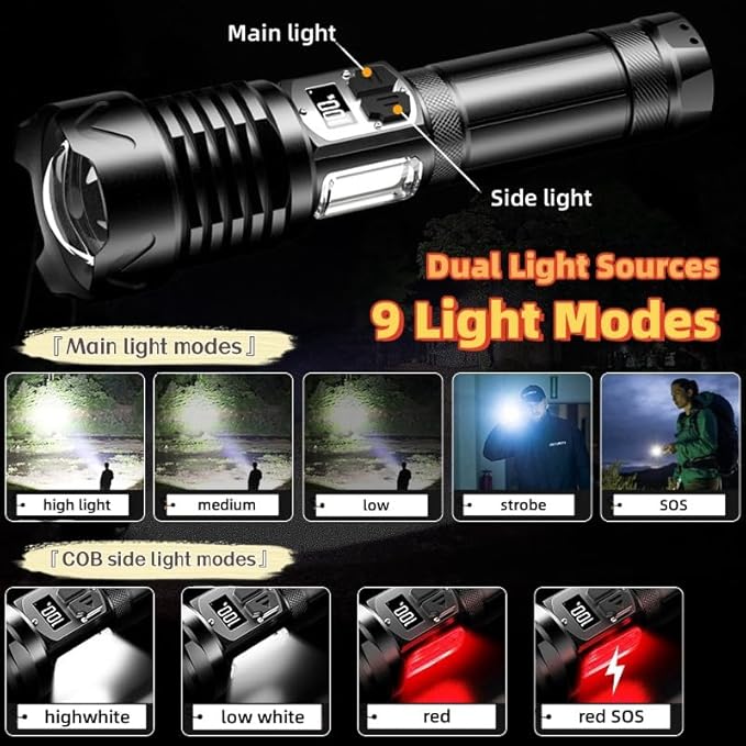 - 2. Dual Light Sources, 9 Modes: This multifunctional flashlights offers 9 lighting modes and independent switches for the main and work lights. Main light modes include high, medium, low, strobe, and SOS. COB side light modes are white, red, and red SOS.