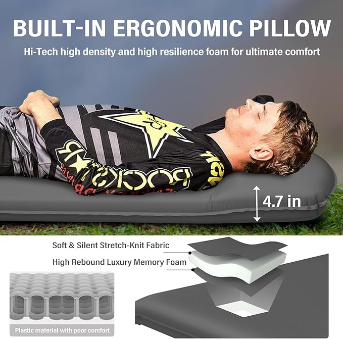 - 3.1 INCH FOAM SLEEPING PAD - Comfort camping pad is made of high-density, high resilience memory foam and tear-resistant fabric, 3.1 inch thickness, curved pillow shape, lay down without feel touching the ground, no different from your bed at home, perfect support and comfort.
