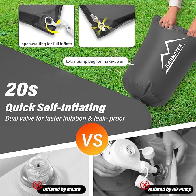 - RAPID AUTOMATIC INFLATION - Just open the inflatable valve port to let the air in for a while can automatically inflate the camping mattress, we also extra equipped with an inflatable bag, you can according to their own needs for softness and hardness, flexible choice of whether you to use the inflatable bag, which is a good helper to replenish the air in camping sleeping pads.