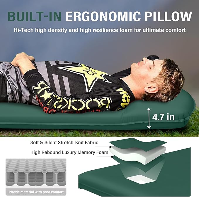 - 3.1 INCH FOAM SLEEPING PAD - Comfort camping pad is made of high-density, high resilience memory foam and tear-resistant fabric, 3.1 inch thickness, curved pillow shape, lay down without feel touching the ground, no different from your bed at home, perfect support and comfort.