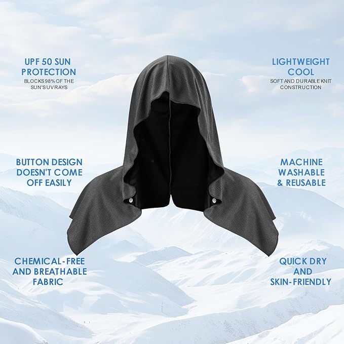 - 【QUALITY MATERIAL】:Cooling hoodie towel is made of high-quality microfibers with a mesh pattern, is breathable, UV protection, lightweight soft, durable and easy to fold. Not only skin-friendly for the neck and face or other body areas, it's also chemical-free and safety for all users. The special structural design allows it to maintain cooling and dissipate heat in summer.