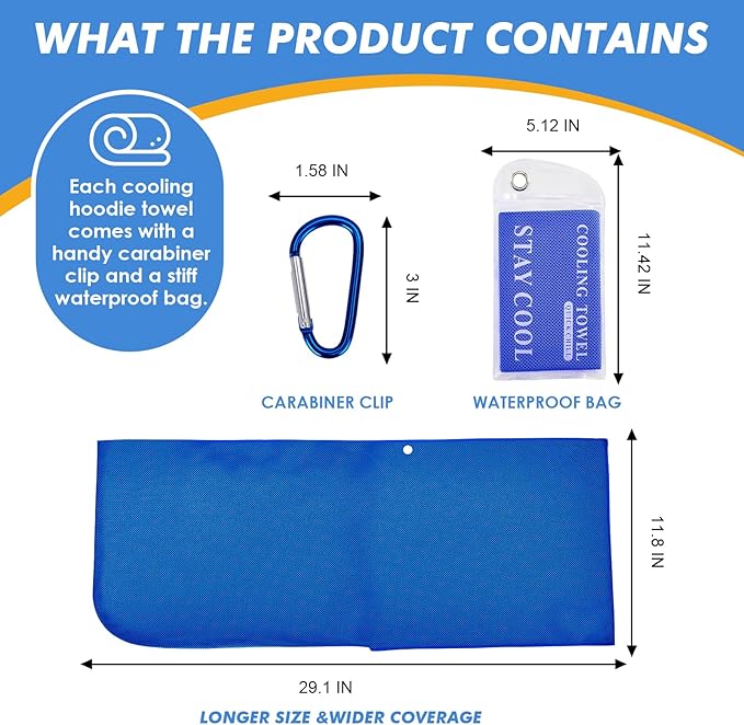 - 【EASY TO CARRY & CLEAN】 : Each cooling hoodie towel comes with a waterproof plastic pouch and a carabiner clip, allowing you to effortlessly carry it for sport, yoga, golf or working out. They're easy to store and conveniently attachable to sports bags and travel backpacks.During exercise, it can be used as neck cooling wrap, sweat-absorbent rag and more. Cold towels can be hand-washed or machine-washed and reused.