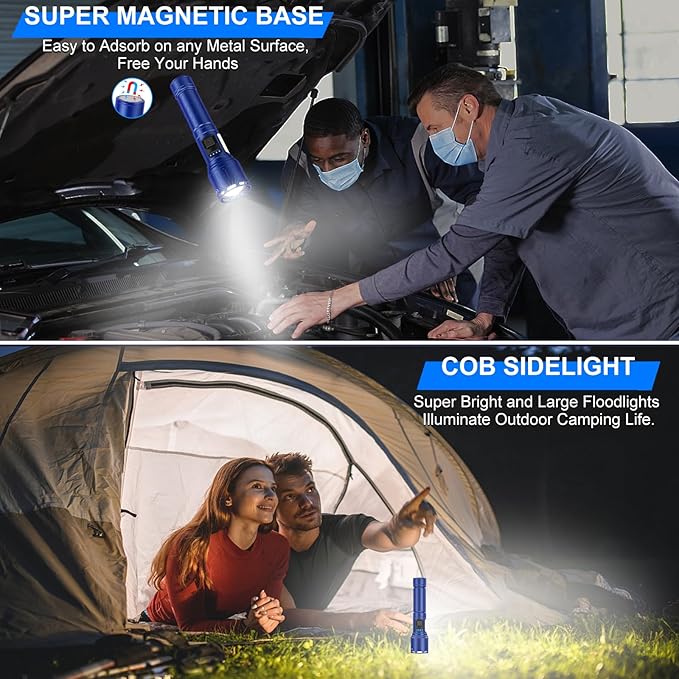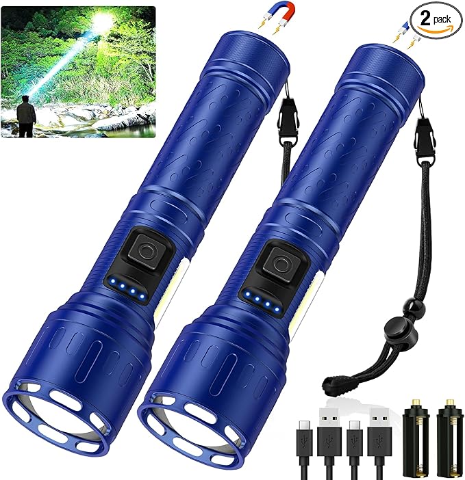 Rechargeable Magnetic Flashlights 100,000 High Lumens, Super Bright LED Powerful Flashlight 8 Modes with COB Work Light, Waterproof Handheld Flash Light for Camping (2 Pack with Paper Box, Blue)