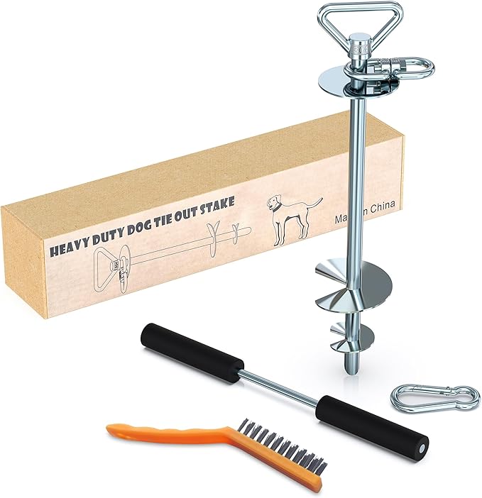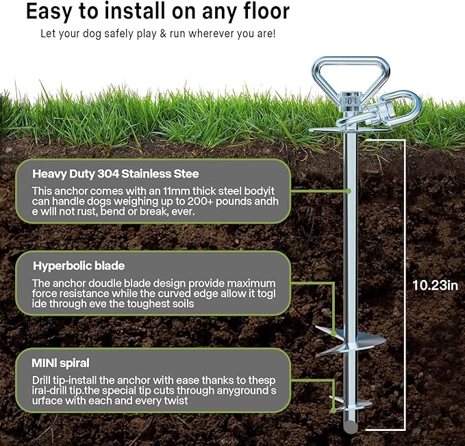 - Easy to Install:The dog anchor is designed with an auger bit and curved double-edged and comes with a comfortable soft-grip stainless steel pole, you just need to rotate it a few times easily and the sharp curved double-edged slides on the ground surface for a smooth and seamless installation. NOTE: You must twist the dog stake into the ground when installing, otherwise the stake can be easily pulled out and your dog will get los